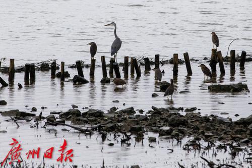 海珠湖,鸟类停在枯木上休息。