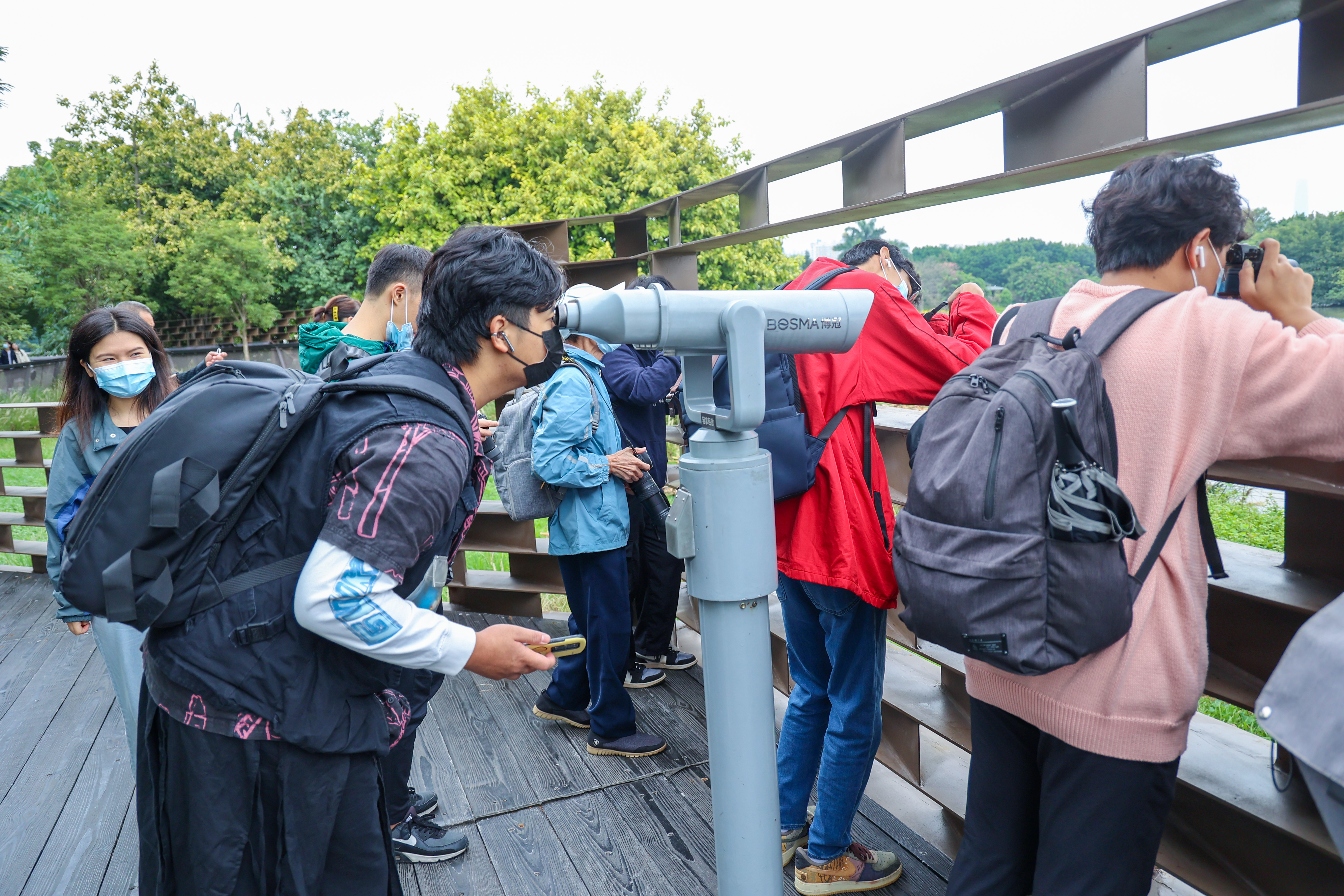 参与活动的摄影师在使用望远镜观察海珠湖上的鸟类。