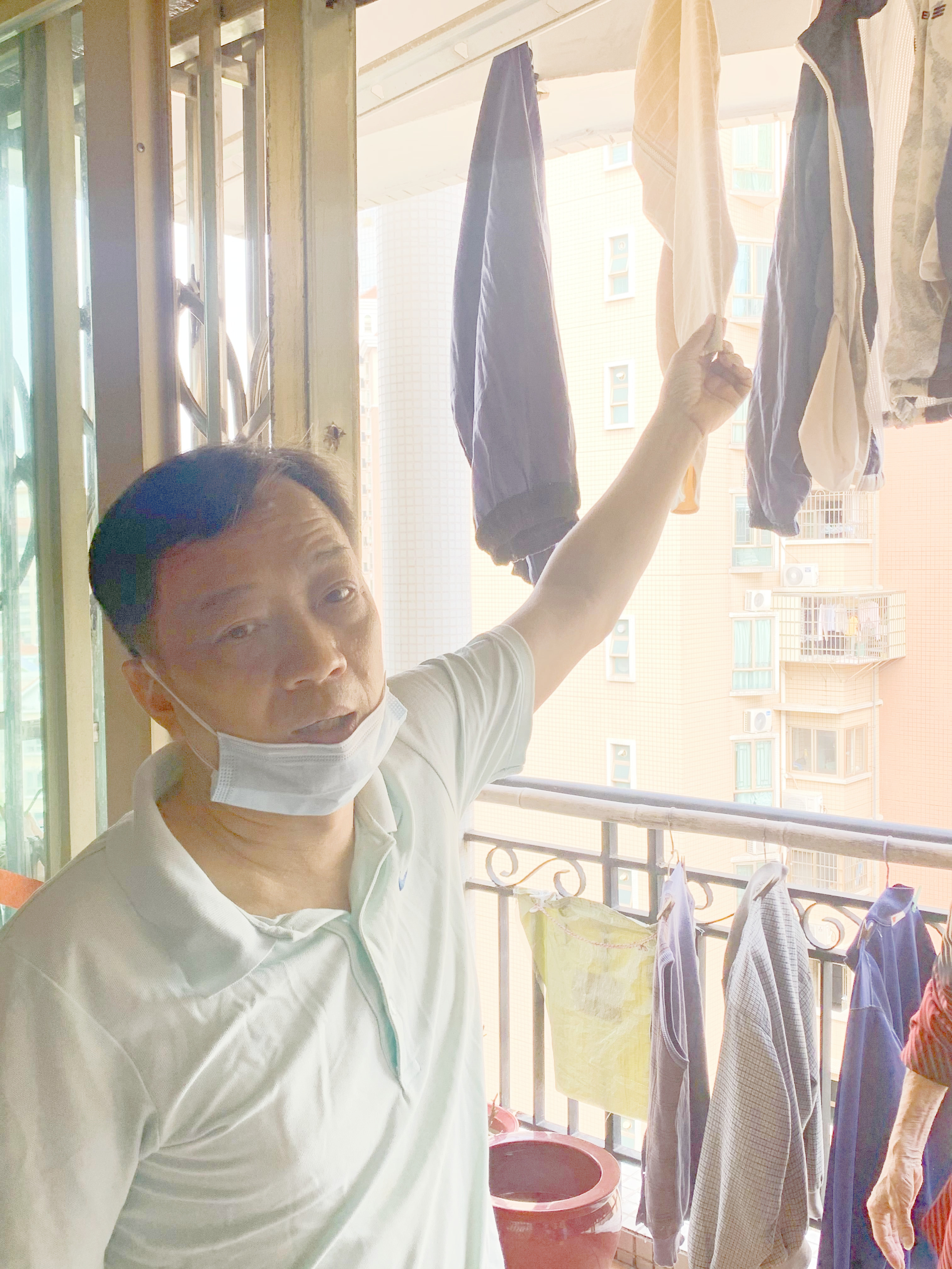 在刘沛强家的阳台上,随处可见晾晒的席子还有备用的尿不湿,由于老人大小便失禁,有时候那边刚刚给他换好,这边又拉了,刘沛强总是耐心地一遍又一遍地为父亲擦洗身体。看到儿子的辛苦,母亲陈娟有些心疼。“他才50多岁,已经有很多白头发了。我很心疼。”陈娟哽咽着说。