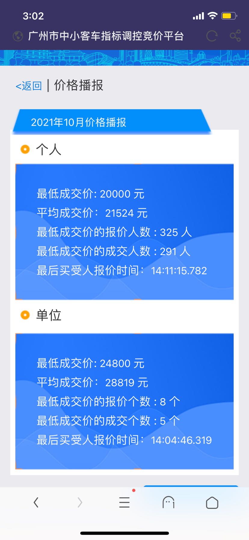 单位竞价方面,10月粤A车牌的单位平均成交价为28819元,较9月单位平均成交价29955元下降1136元,8月单位平均成交价为37841元;5个单位以最低成交价24800元成交,9月单位最低成交价为25000元,8月为28000元。