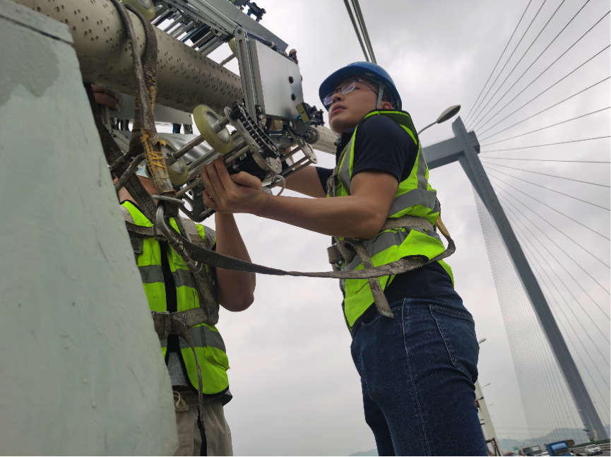 记者了解到,此次引进的桥梁缆索智能检测机器人设备可行走于不同直径的桥梁索杆,跨越缠绕线、克服缆索破损等障碍进行现场检测,并可通过视频无线传输及机械记米系统,对病害所处位置进行准确定位。同时,使用桥梁缆索智能检测机器人,还能够在检测中避免对拉索PE和缠绕线造成损坏,从而实现更稳定的抗环境干扰能力,为桥梁主塔、斜拉索等检测项目的顺利开展提供更高效、更强有力的技术保障。