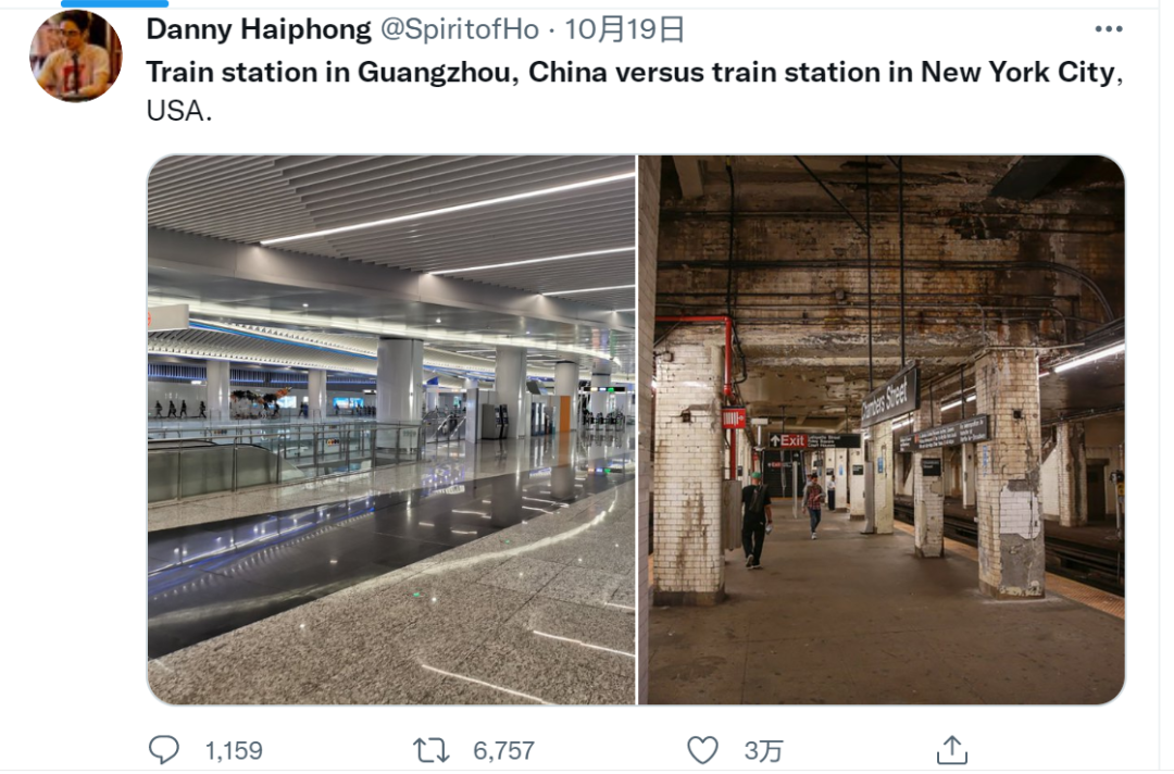 The Guangzhou resident found an echo in the tweet of Danny Haiphong, an activist and writer who posted two photos of the NYC subway and Guangzhou metro on October 19 and tweeted that "Train station in Guangzhou, China versus train station in New York City, USA."