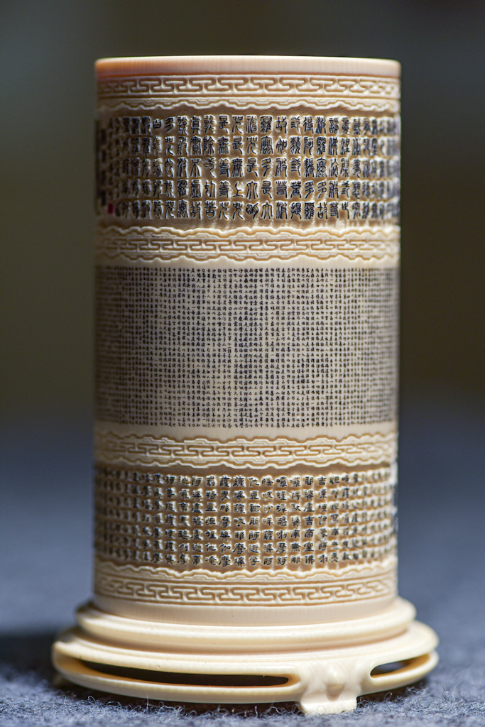 记者在现场看到,“麻将牌”上的《唐诗三百首》最受瞩目。作者在一张麻将牌大小的猛犸牙牌上镌刻了《唐诗三百首》,全文21600字,每字仅0.08平方毫米。另外一件展品,作者以阳刻手法在不到一平方厘米的筷子头上雕刻了261字的《心灵经》 ,即每平方毫米容纳5.3个字,目前朱德祥正以此件作品冲击吉尼斯纪录。
