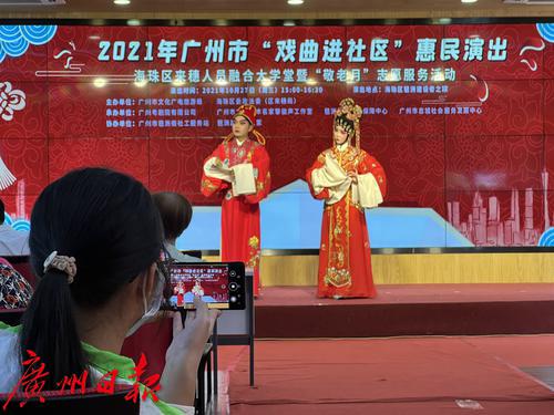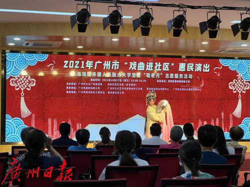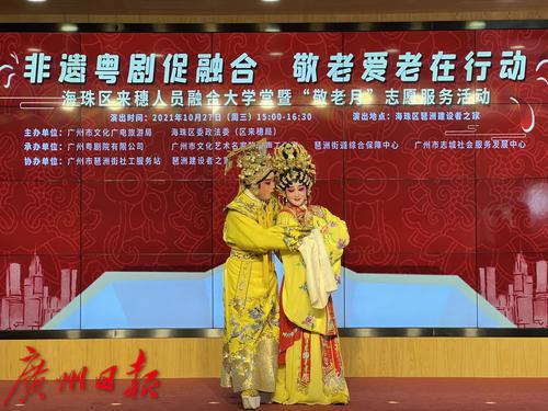 为促进海珠区来穗人员参与融合社区建设,提升来穗人员归属感和幸福感。10月27日下午,由海珠区委政法委(区来穗局)联合广州粤剧院有限公司、琶洲街综合保障中心、广州市志城社会服务发展中心共同举办“非遗粤剧促融合,敬老爱老在行动”——海珠区来穗人员融合大学堂暨“敬老月”志愿服务活动。活动开始前,由社工带领来穗志愿者与社区长者进行结对认识环节,建立初步的认识关系,为后续共同观赏交流粤剧文化做热身。现场,来自广州市文化艺术名家黎骏声工作室的11位粤剧艺术家,为40名社区长者和来穗人员表演了《七月七日长生殿》等4出经典折子戏和1首《花田错会》的粤曲时装对唱。演员唱腔优美动人,曲调婉转悠然,故事情节感人,赢得现场观众热烈的掌声和喝彩声。活动最后,主办方为参与活动的20多名社区弱势长者送上敬老礼包。