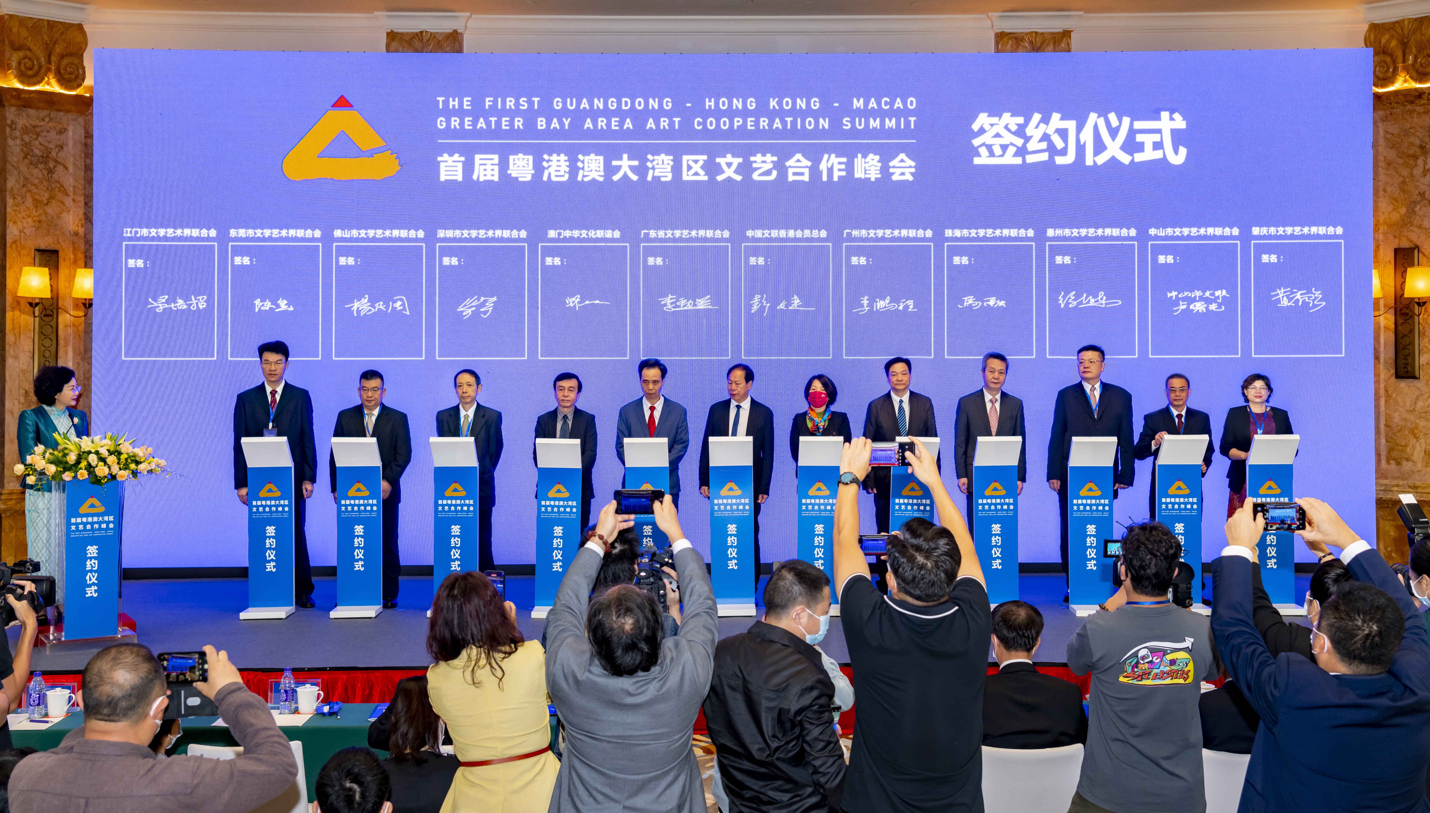 10月27日上午,广东省文学艺术界联合会和中国文联香港会员总会、澳门中华文化联谊会以及广州、深圳、珠海、佛山、惠州、东莞、中山、江门、肇庆9个城市文学艺术界联合会12家单位的代表在珠海共同签署《粤港澳大湾区文艺合作峰会成员单位合作备忘录》。