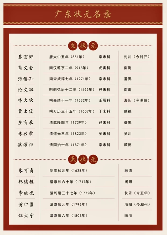 这些状元分别有:莫宣卿、简文会、张镇孙、伦文叙、林大钦、黄士俊、庄有恭、林召棠、梁燿枢这9位文状元,朱可贞、林德镛、李威光、黄仁勇、姚大宁这5位武状元。他们以儒家的仁义道德为精神信仰,在不同的领域施展抱负,在历史上隽刻下自己的身影。
