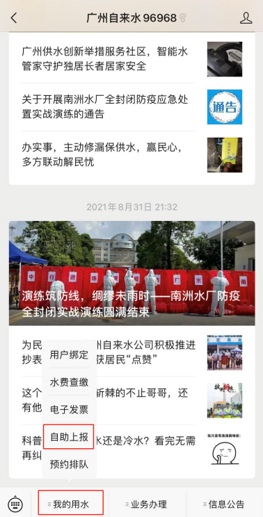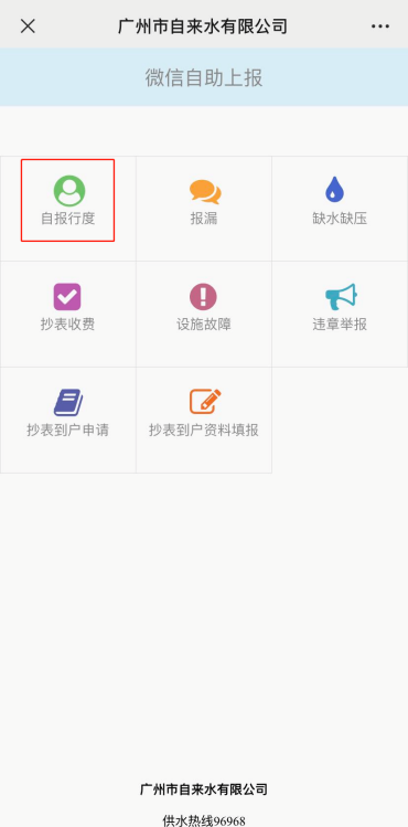 2 、点击左下角“我的用水”--“自助上报”,选择“自报行度”