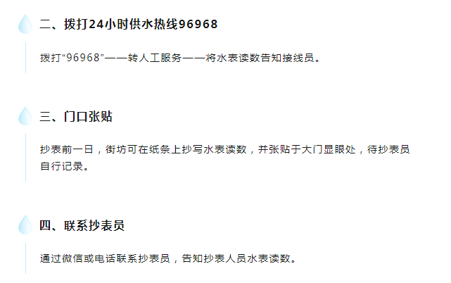 小e从广州市自来水有限公司获悉,目前有4个实用的自报行度方法。家中不留人也能报,方便又简单!市民可于抄表日期前5天0时至抄表日期前1天24时期间,通过以下几种方式自报水表行度: