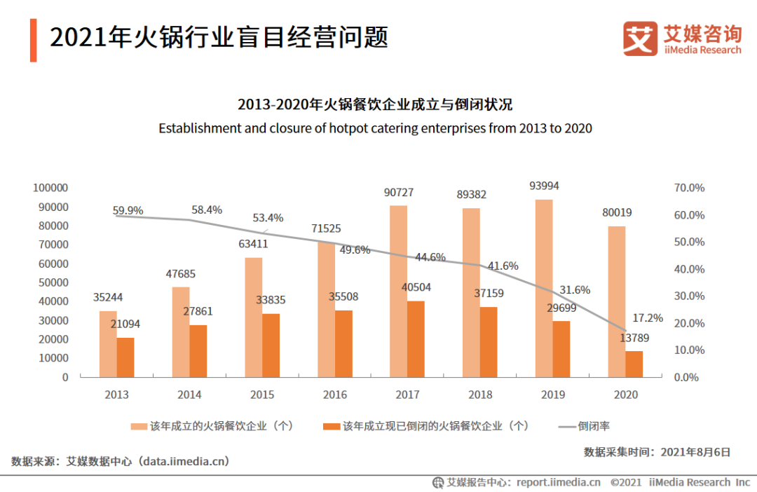 毫无疑问,火锅已经成为竞争最激烈的赛道之一。越来越多的人杀入赛道,但同时也有越来越多的人倒下。研究报告数据显示,2016年和2019年成立的火锅餐饮企业倒闭率分别约为50%和30%,有半数左右的火锅餐饮企业活不过5年,约3成的火锅餐饮企业在两年内倒闭。