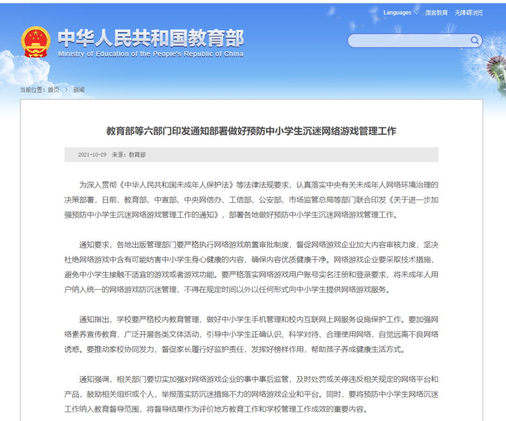 教育部等六部门印发通知部署做好预防中小学生沉迷网络游戏管理工作