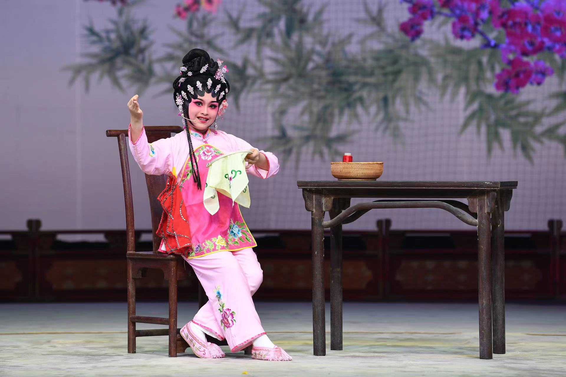 广州市番禺区傍江东小学的学生演出的《杨门女将·探谷》。饰演穆桂英的叶芷晴在后台勒头时也疼哭了,“但是一上场听到音乐马上就振作起来了,认真地演完这12分钟,吸足了气再唱。学粤剧让我有很强的意志力,通过学习也让我比别人唱得要好一些。”