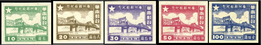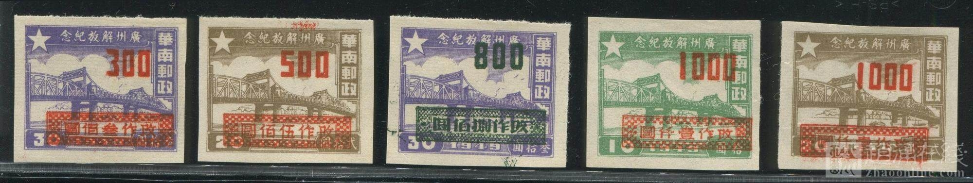 《广州解放纪念》邮票全套5枚,分别为:10元,绿;20元,灰棕;30元,紫;50元,洋红;100元,深蓝。