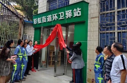 随后,与会人员一行前往彩虹街道环卫驿站,街道代表和环卫职工代表一起举行了简单而隆重的揭牌仪式。