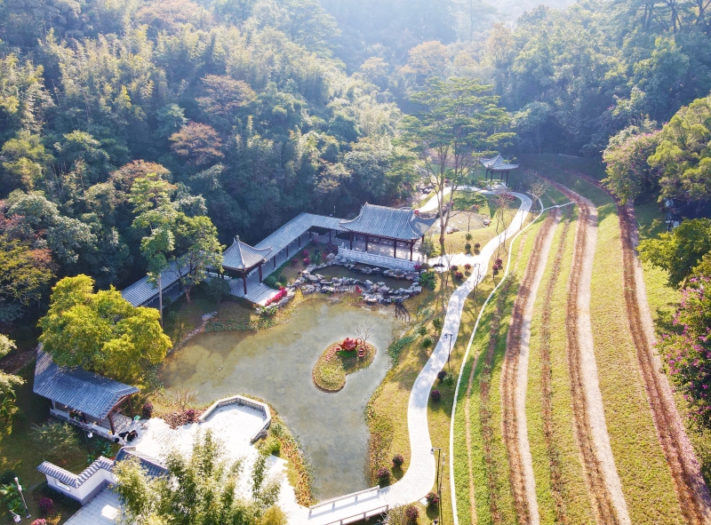 在蒲谷花园,拆除原蒲谷餐厅及配套建筑,结合廉洁文化主题景点打造岭南沟谷雨林景观,新建避雨亭廊、塑石、园路、铺装,种植绿化,提升蒲谷内两条水系的景观。
