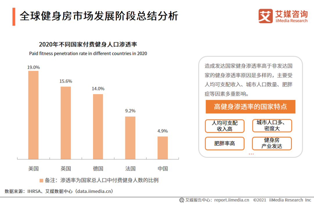 中国健身行业市场规模近几年不断增长,预计2021年市场规模将继续增长并达到3771亿元。2020年中国健身房会员7029万人,渗透率为4.87%,而美国健身房会员的渗透率为19.0%,这意味着中国的健身房事业具有巨大的发展潜力。