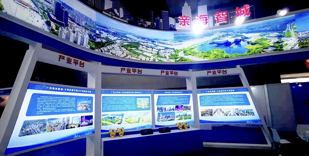 番禺城市建设展馆的布景以“华南枢纽 岭南水乡 湾区门户 高铁新城、亲海智城”为主题,显示着今后番禺的发展定位。