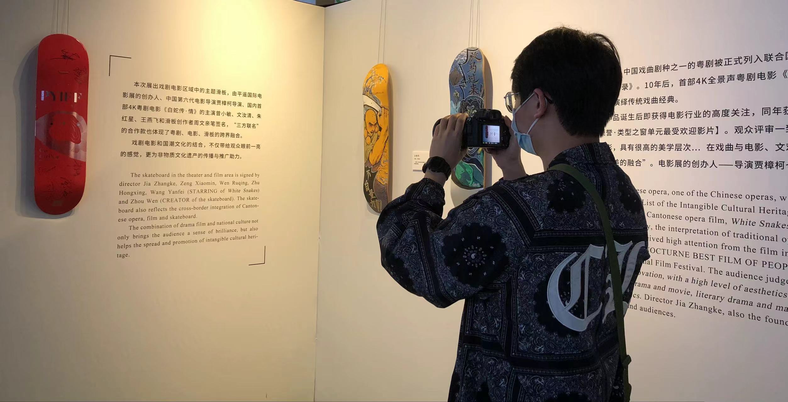 “影”部分的策展构思结合了今年火爆出圈的戏曲电影《白蛇传·情》的内容元素,现场展出由平遥国际电影展创办人、《白蛇传·情》主演与滑板创作者“三方联名”的合作款滑板,体现电影、粤剧、滑板的跨界融合理念,以新鲜的电影语言和国潮文化为非遗的推广传播赋能。