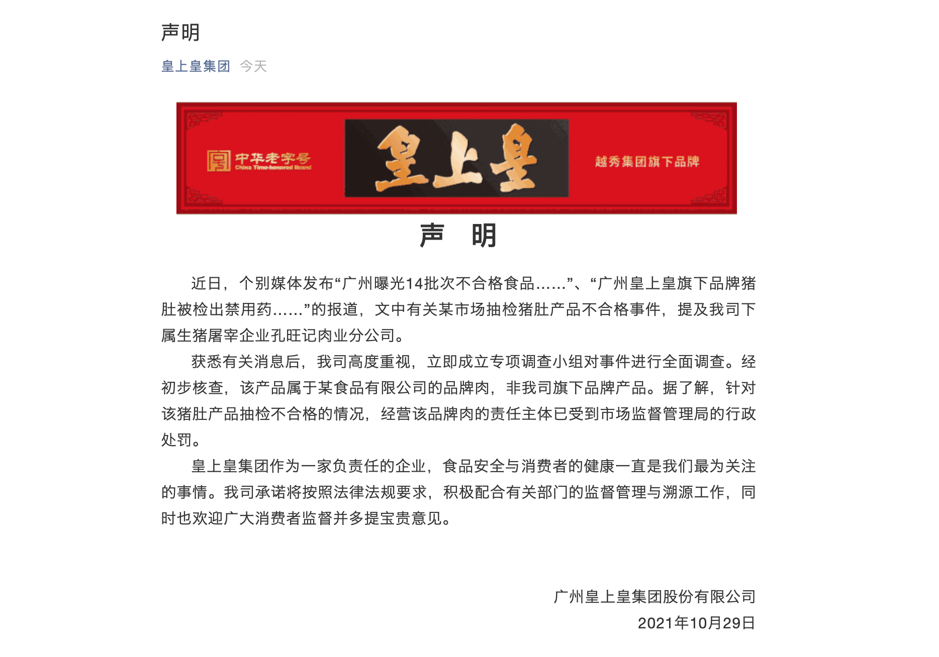 近日,广州市市场监管局公布41批次不合格食品,信息显示皇上皇集团下属生猪屠宰企业孔旺记肉业分公司产品猪肚被检出氯霉素。10月29日晚,皇上皇集团发布官方声明称,公司高度重视,立即成立专项调查小组对事件进行全面调查。经初步核查,该产品属于某食品有限公司的品牌肉,非其公司旗下品牌产品。