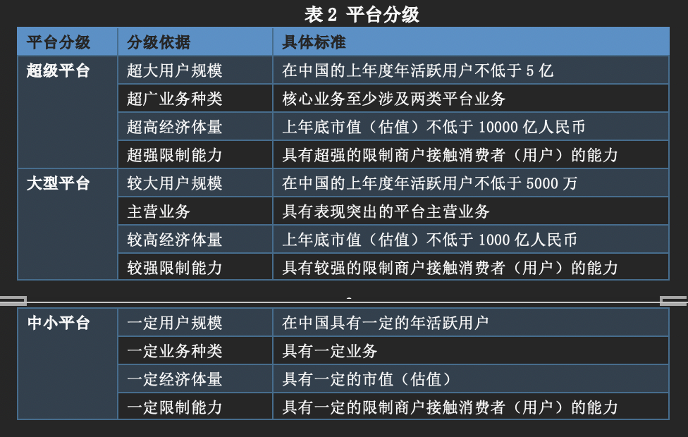 其中,超级平台在中国的上年度年活跃用户不低于5亿、核心业务至少涉及两类平台业务、上年底市值(估值)不低于10000亿人民币、具有超强的限制商户接触消费者(用户)的能力;大型平台在中国的上年度年活跃用户不低于5000万、上年底市值(估值)不低于1000亿人民币;中小平台在中国具有一定的年活跃用户、具有一定的市值(估值)等。