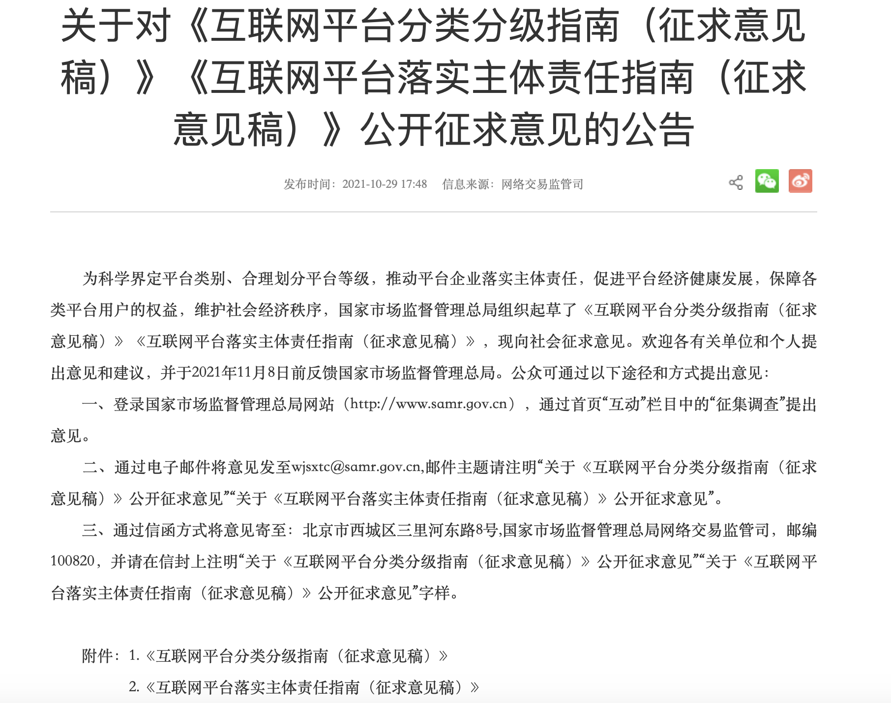 10月29日,据国家市场监管总局官方网站消息,为科学界定平台类别、合理划分平台等级,推动平台企业落实主体责任,促进平台经济健康发展,保障各类平台用户的权益,维护社会经济秩序,国家市场监督管理总局组织起草了《互联网平台分类分级指南(征求意见稿)》《互联网平台落实主体责任指南(征求意见稿)》,现向社会征求意见。