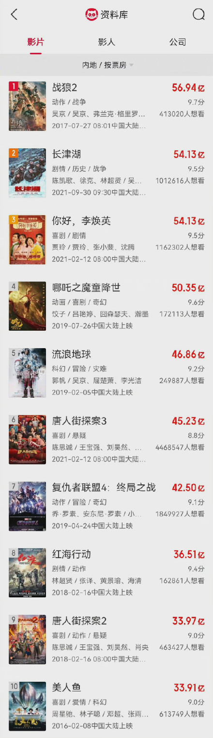 据猫眼专业版数据,10月30日9时2分,《长津湖》累计票房超54.13亿,正式超过《你好,李焕英》票房成绩,成为2021全球票房冠军,暂列中国影史票房榜第二名。