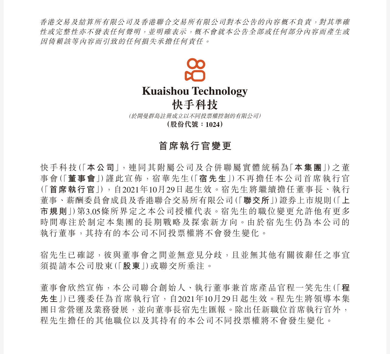 10月29日晚,快手科技发布公告称,董事会已同意公司联合创始人宿华辞去首席执行官一职,并已批准联合创始人程一笑担任该职务,自2021年10月29日起生效。宿华将继续担任董事长、执行董事、薪酬委员会委员,负责制定公司长期战略。程一笑作为首席执行官将负责公司日常运营及业务发展,并向董事长宿华汇报。
