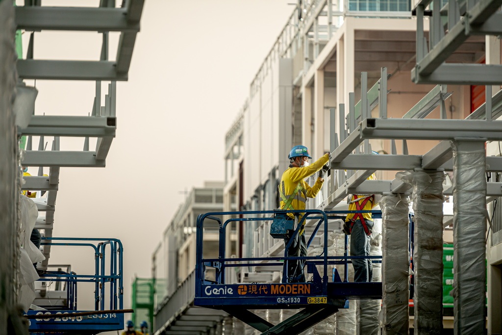 中央援建的港版「火神山醫院」——北大嶼山醫院香港感染控制中心,建設者加班加點,永不停休。 中國建築國際集團 供圖