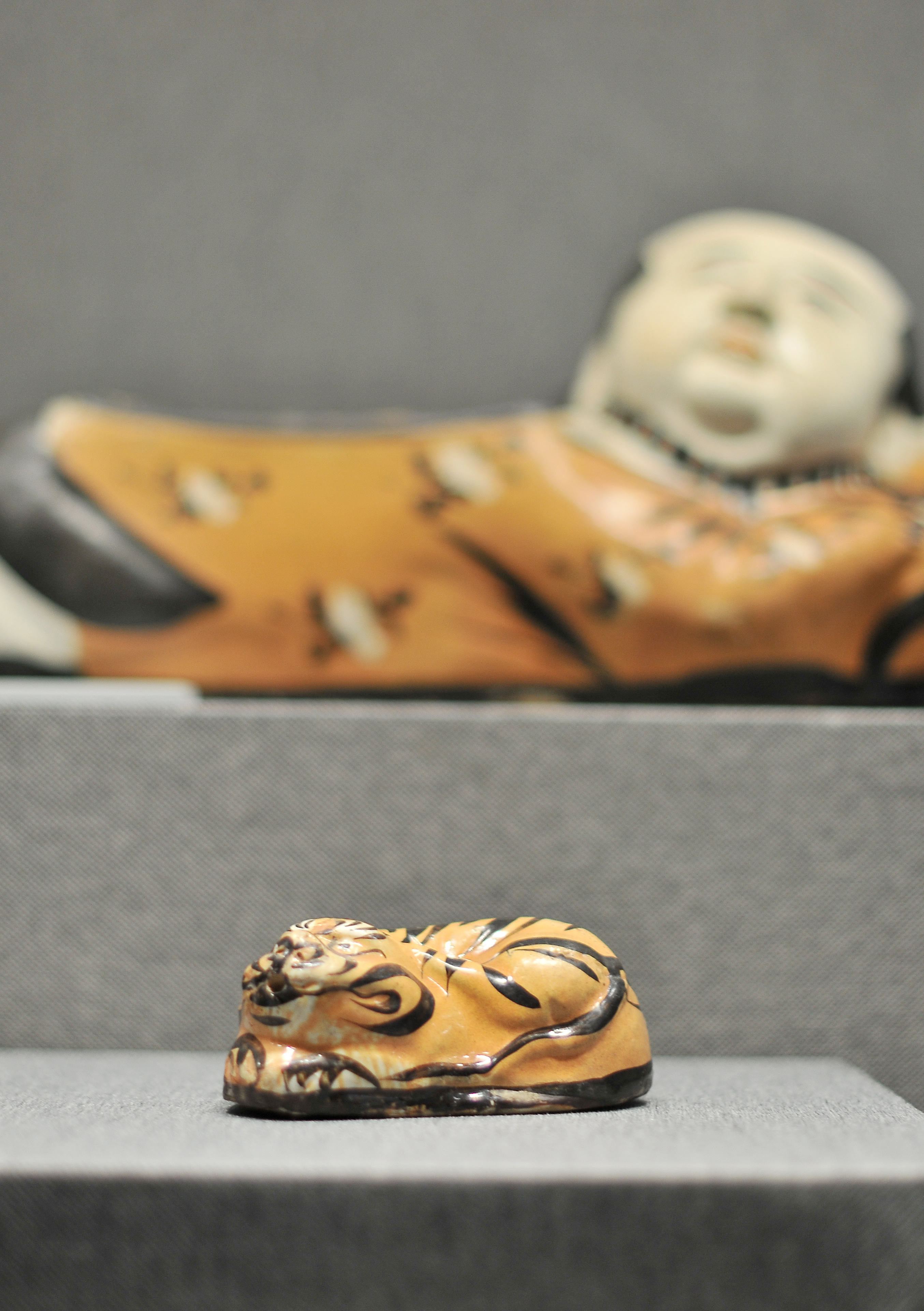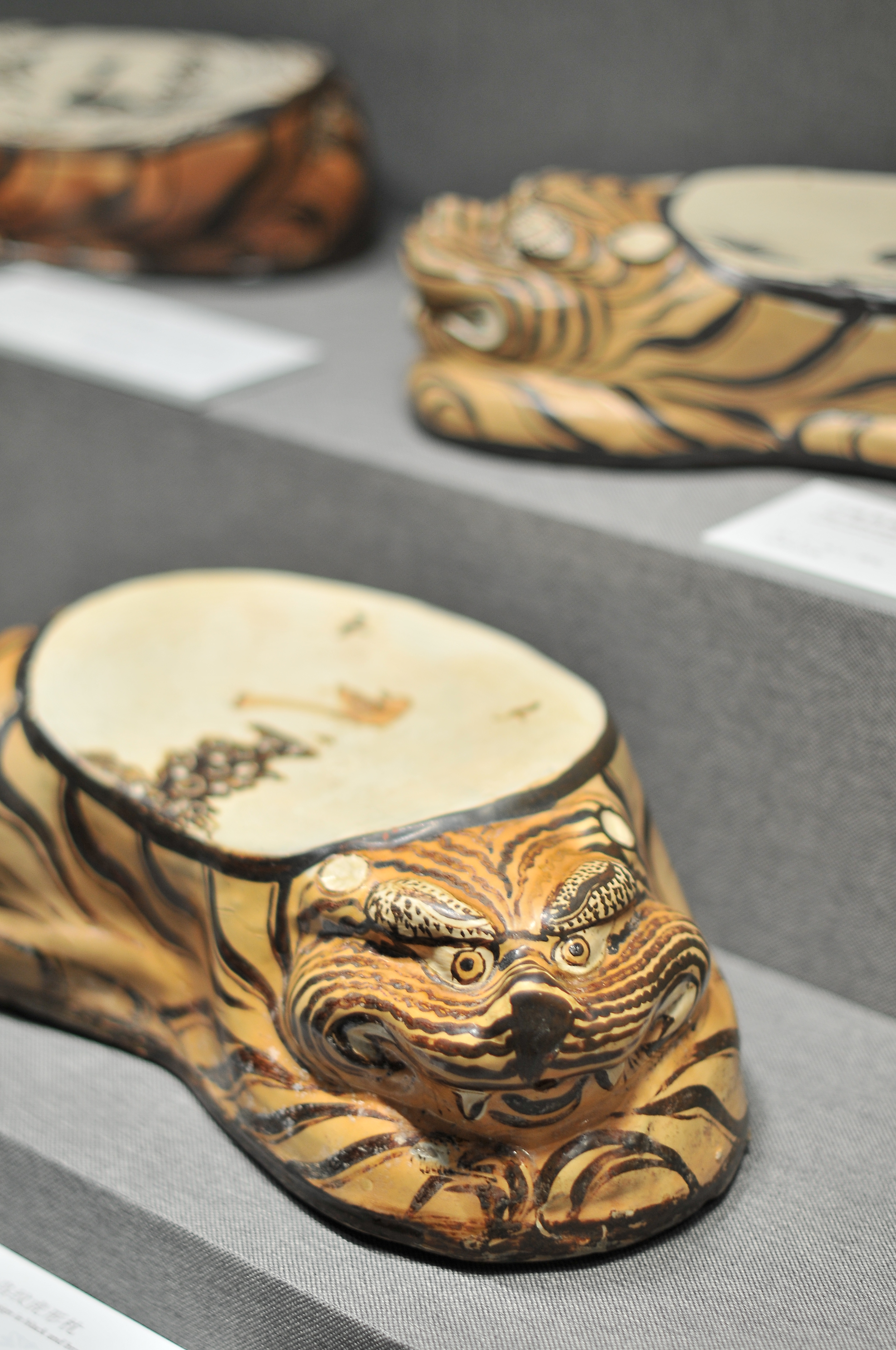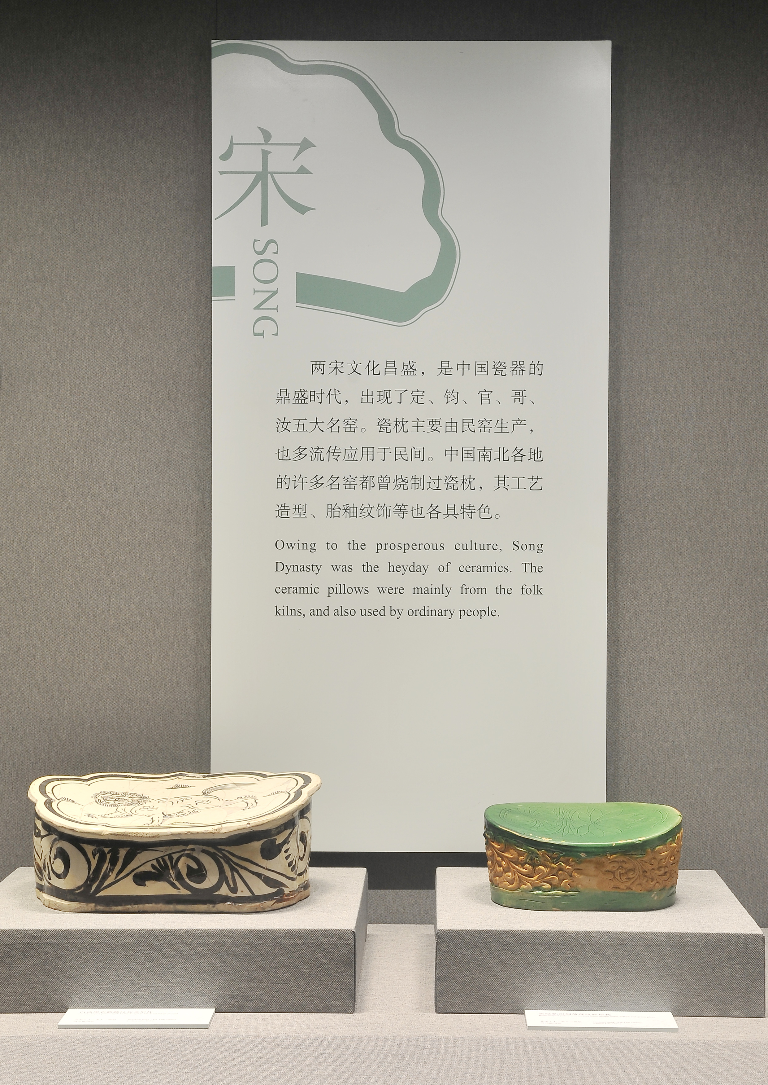 南越王博物院的专家介绍,杨永德伉俪捐赠枕的窑口以唐宋以来北方主要产瓷区的河南、河北为主,举其要者有河南省巩县的唐三彩枕和绞胎枕,密县和登封窑的珍珠地划花纹枕;宝丰清凉寺窑的青釉枕、三彩枕、绿釉枕及双狮座枕;修武当阳峪窑、鹤壁集窑的白地黑花枕;河北省磁州窑的黑白花枕、绿釉枕;定窑白釉枕和黑釉枕;亦有山西和陕西窑的制品,如山西晋南地区的白釉划花卉、文字枕和褐釉虎形枕;陕西耀州窑的茶末釉狮枕,还有安徽寿州窑的黄褐釉贴花枕;也有出自南方的湖南、江西等地的瓷枕。如唐代的长沙窑釉下彩枕,景德镇窑的影青枕等。