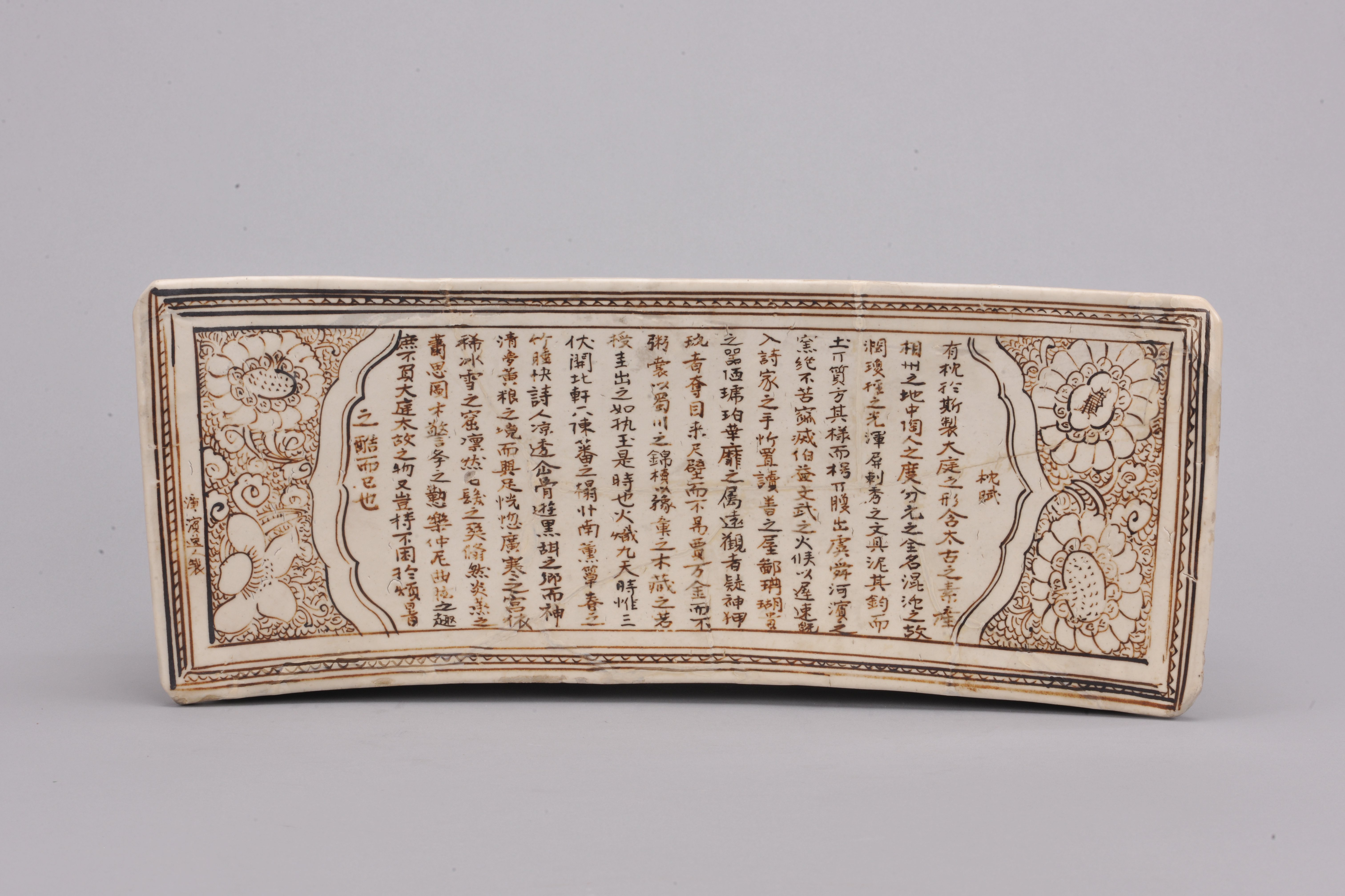 由于这些瓷枕出自民窑,其装饰题材主要采自自然景物和民间生活情景,亦有寓意吉祥的,反映着当时当地的民情风俗。此外,还有作人物山水书画和诗文题咏的,其中一件长方形的磁州窑诗文枕,枕面书《枕赋》篇,洋洋洒洒全文两百五十九字,为诗文枕中唯一。