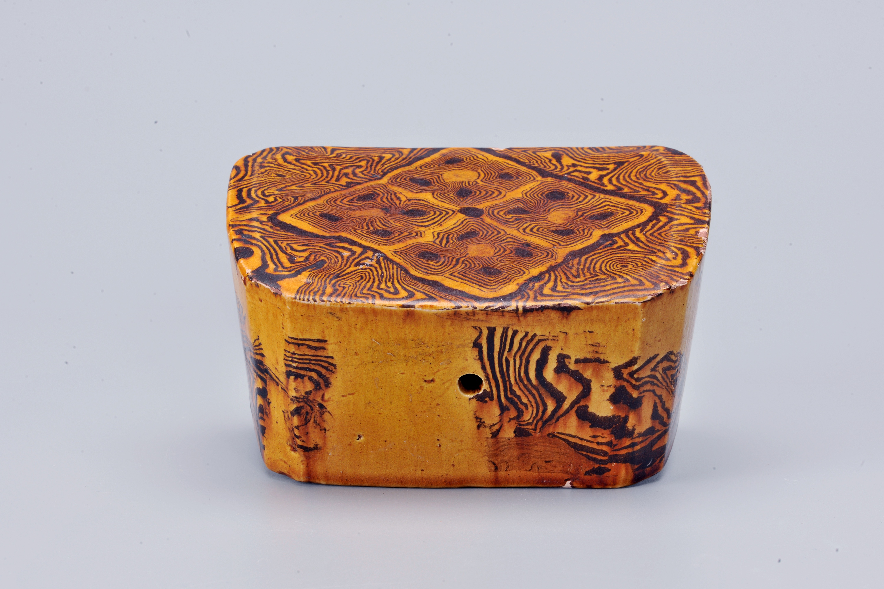 晚唐-巩县窑-黄釉绞胎菱花纹长方形枕