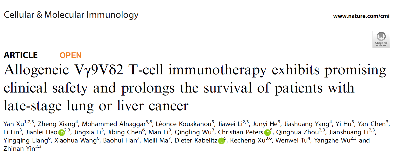 尹芝南团队的同种异体 Vγ9Vδ2-T 细胞治疗晚期肿瘤的最新研究成果登上《Cellular & Molecular Immunology》网络版