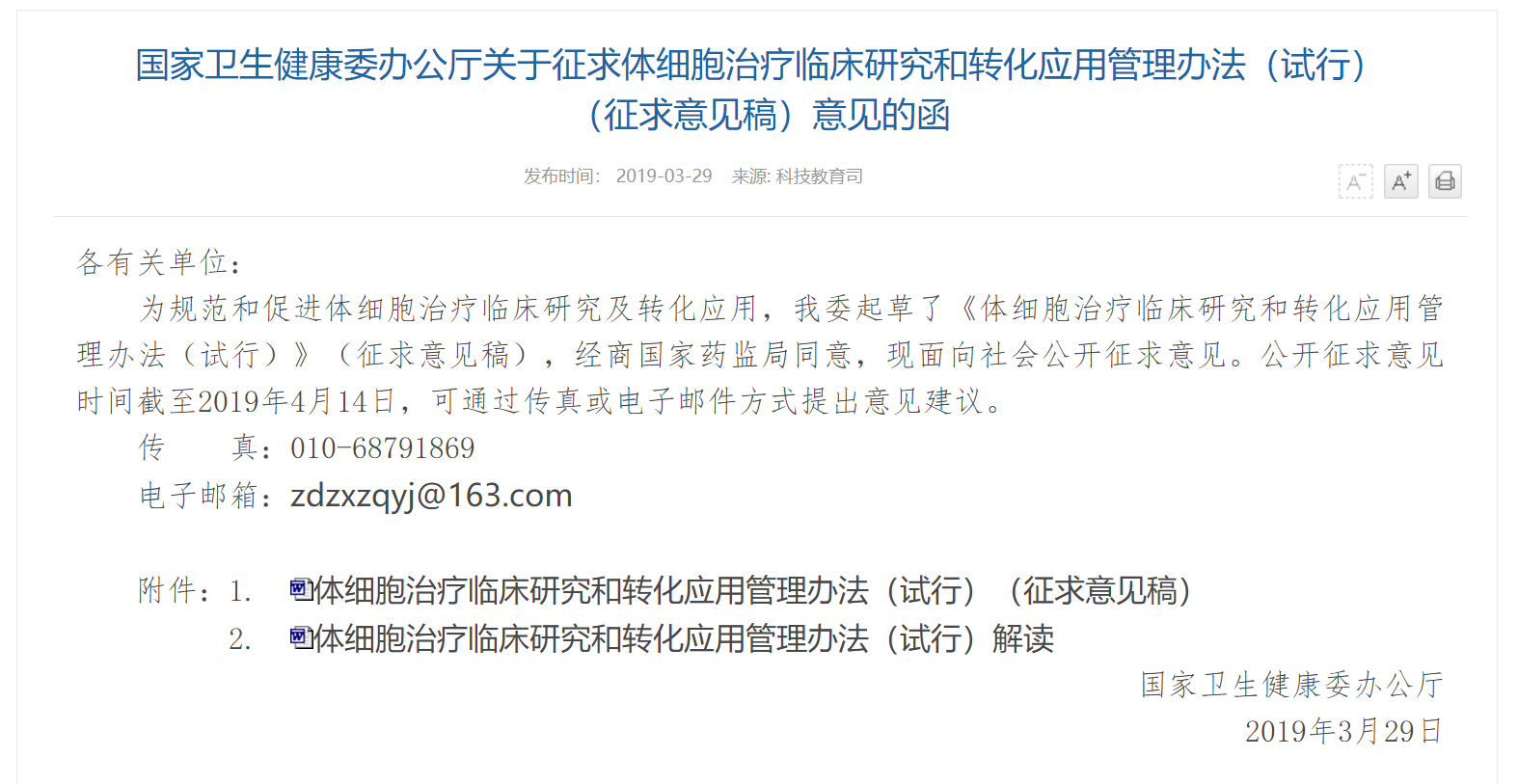 2019年3月29日,国家卫生健康委办公厅发布了《关于征求体细胞治疗临床研究和转化应用管理办法(试行)(征求意见稿)意见的函》(以下简称《征求意见稿》)。《征求意见稿》指出对体细胞临床研究进行备案管理,并允许临床研究证明安全有效的体细胞治疗项目经过备案在相关医疗机构进入临床应用,由申请备案的医疗机构按照国家发展改革委等4部门《关于印发推进医疗服务价格改革意见的通知》(发改价格〔2016〕1431号)有关要求,向当地省级价格主管部门提出收费申请,但临床研究阶段不得向受试者收取任何研究相关费用。
