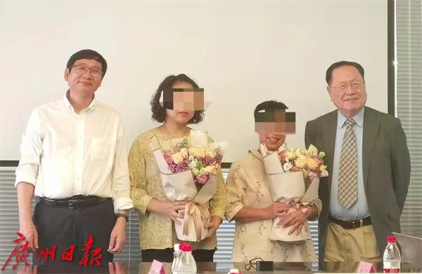 患者郜女士、巫女士(皆为化名)与尹芝南(左一)、暨南大学附属复大肿瘤医院徐克成(右一)合影。