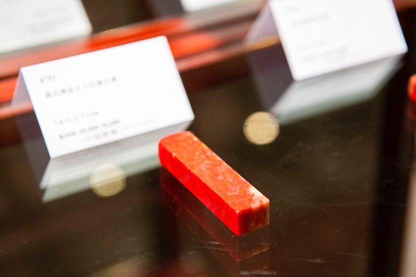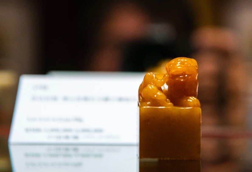 一座玻璃橱窗前,围满了观赏者。橱窗里摆放着49枚印章精品,其中一枚齐白石先生所刻、寿山田黄石太狮少狮钮印,堪称精品中的精品,它大小为2.6×2.6×4.2厘米、重58克,中国嘉德给出的估价为300-400万人民币。