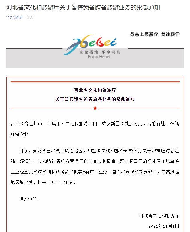 据“河北旅游”微信公众号消息,河北省文化和旅游厅1日发布紧急通知称,目前,河北省已出现中风险地区,根据《文化和旅游部办公厅关于积极应对新冠肺炎疫情进一步加强跨省旅游管理工作的通知》精神,即日起暂停旅行社及在线旅游企业经营河北省跨省团队旅游及“机票+酒店”业务(包括出冀游和来冀游),中高风险地区解除后,相关业务自行恢复。