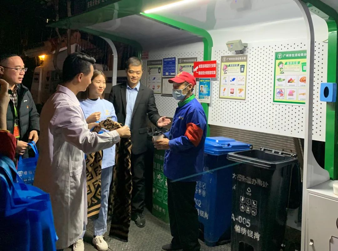 ▲联同社区干部和辖内爱心企业为垃圾分类站桶人员送温暖。