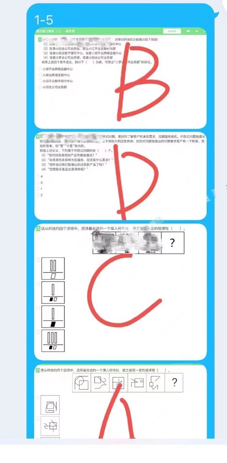 “笔试都没有考前答案,所有说考前答案的全是骗子。我们团队是研究生,3到5人同时做题,行测、金融、经济、计算机、英语、常识、时政,有什么做什么,每个人负责不同的模块,开考以后边做边发答案,速度肯定没问题。”对方信誓旦旦地表示,笔试正确率约80%,“银行题目量大,一般人自己做基本上连蒙带猜正确率百分之二三十,把我的答案都抄上,包进面!”