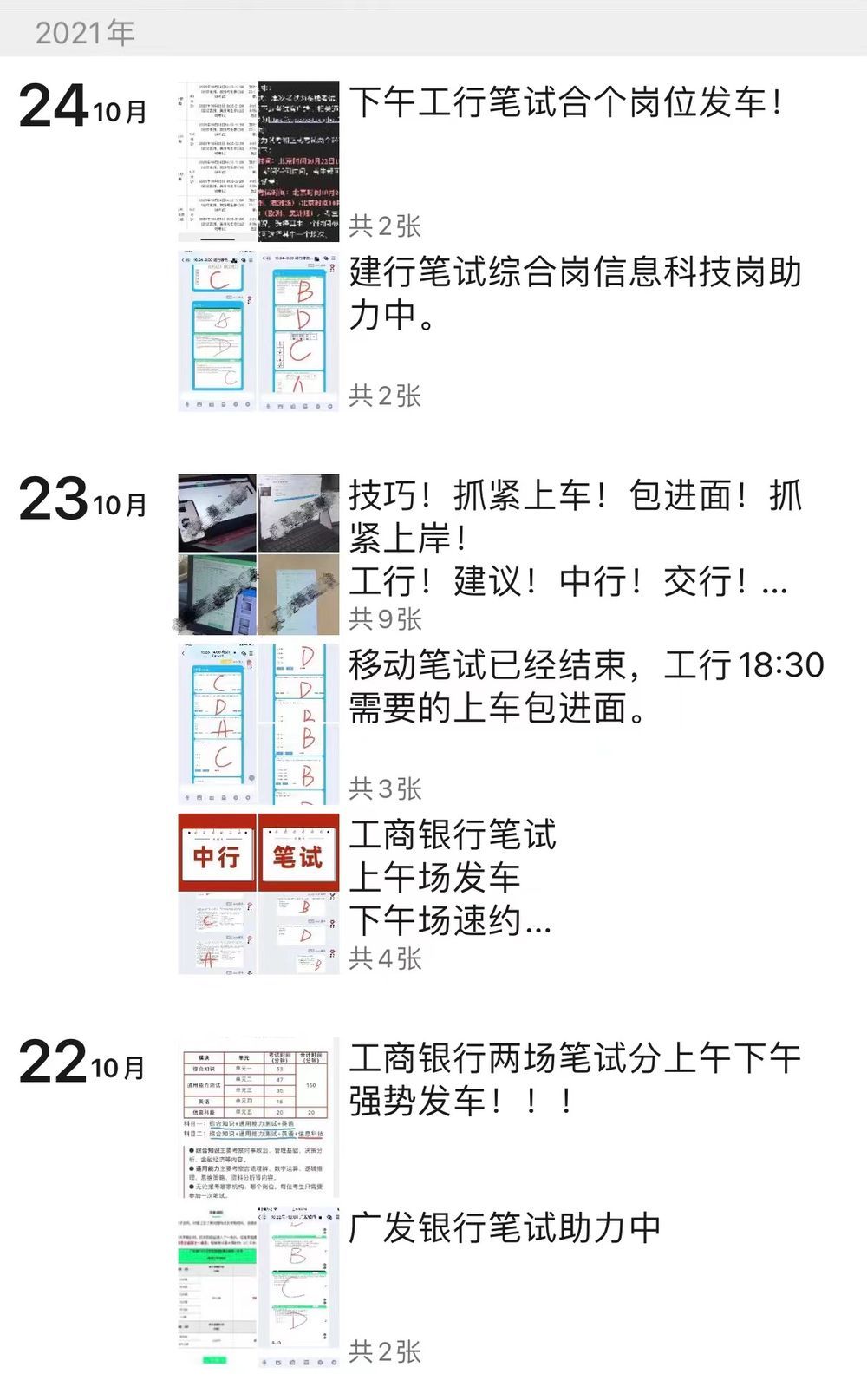 “四大行、交行、邮储、招商、兴业、电信、移动、联通、三桶油等国企,三年助攻经验,包进面试,以往秋招春招100多场笔试题源记录验证,信誉第一……线上笔试抓住机会,花个小几百进面!”以其中一个账号为例,博主特意将封面图片做成“广告牌”,打出业务范围及联系方式。而近期的微博内容,也几乎都与当天的“笔试发车”有关。