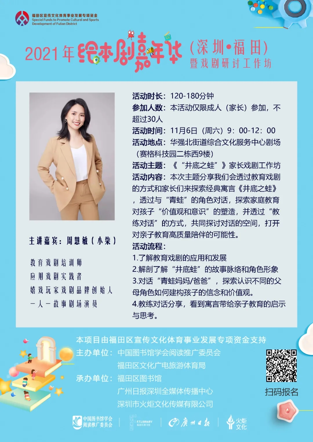 11月6日上午,“绘本剧嘉年华(深圳•福田) 暨戏剧研讨工作坊“将率先亮相华强北街道综合文化服务中心剧场。教育戏剧培训师周慧敏(小柒)将透过教育戏剧的方式和家长们共同来探索经典寓言《井底之蛙》,透过与“青蛙”的角色对话,探索家庭教育对孩子“价值观和意识”的塑造,并透过“教练对话”的方式,共同探讨对话的空间,打开对亲子教育高质量陪伴的可能性。