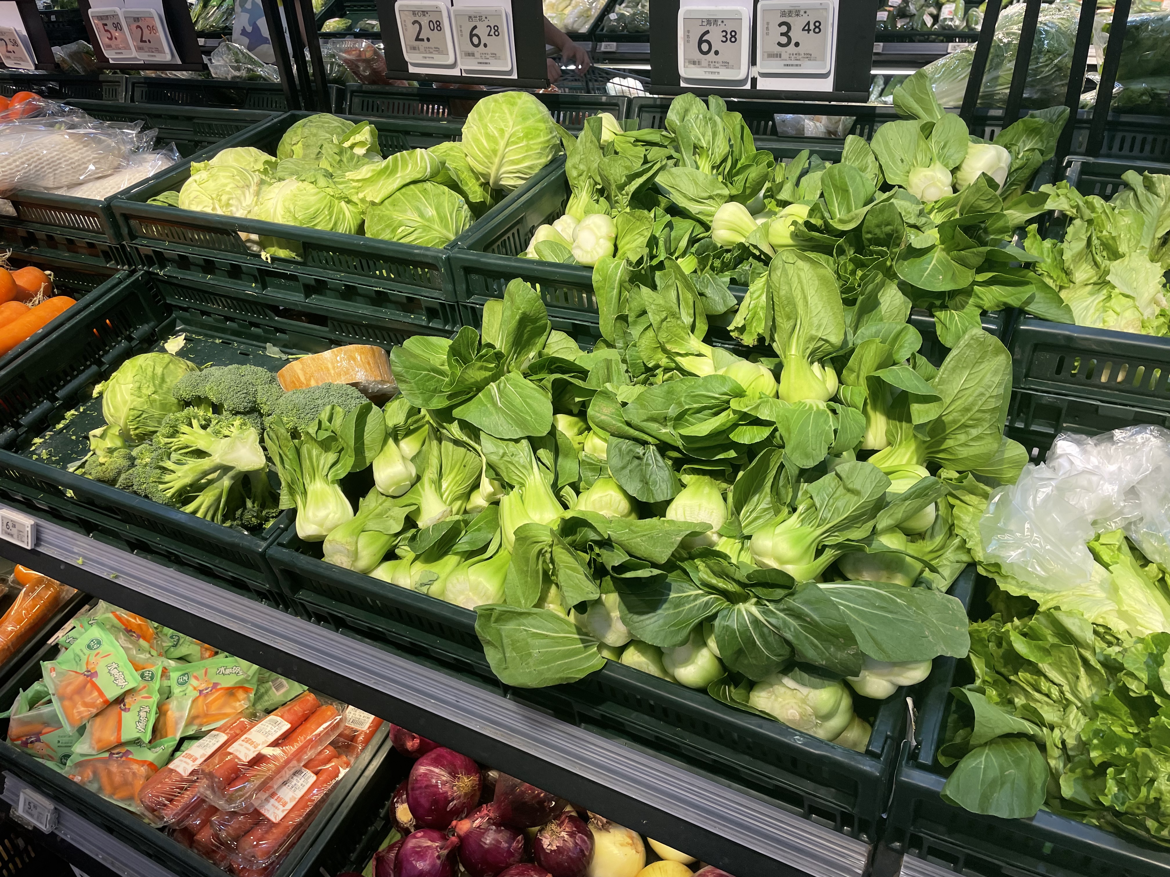 走访线下商超,蔬菜生鲜等生活必需品供应充足,价格稳定