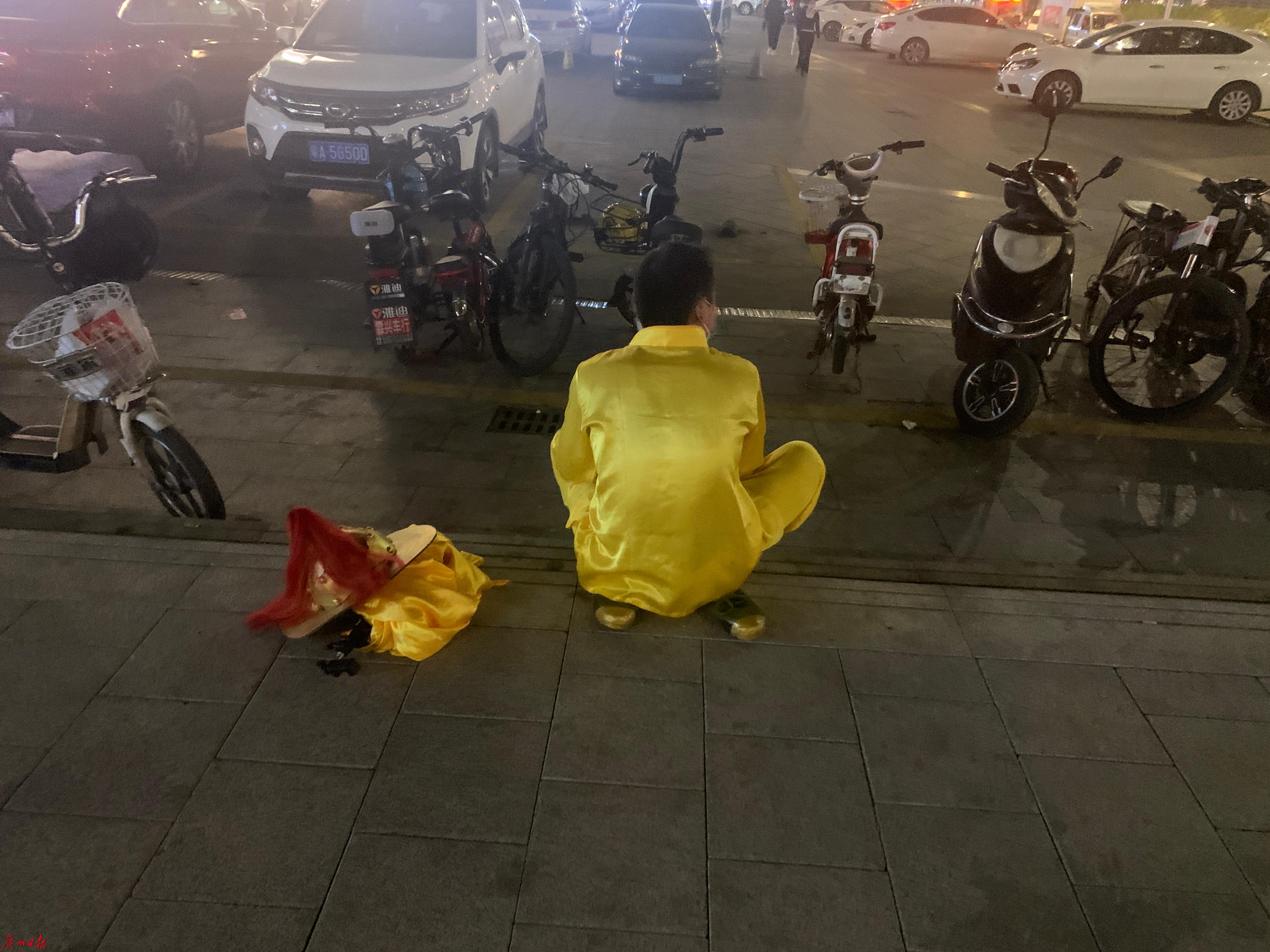 7点左右,记者看到一名身穿黄色绸缎服装、头戴黄帽、手持自拍杆的男子在广场附近徘徊,他告诉记者,他要等执勤人员离开才能开始直播。