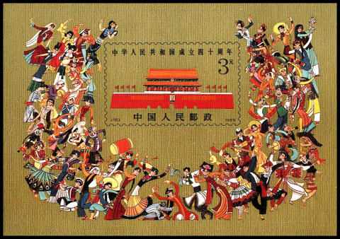 作为第一套展现56个民族的邮票,《中华人民共和国成立四十周年》纪念邮票中的这枚小型张的发行无疑是令人激动的。但由于各民族人物都集中在一起设计,除了民族专家,一般集邮者很难一一识别出每个人物是哪个民族的。