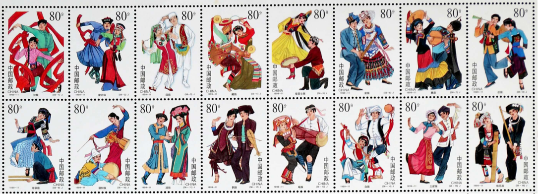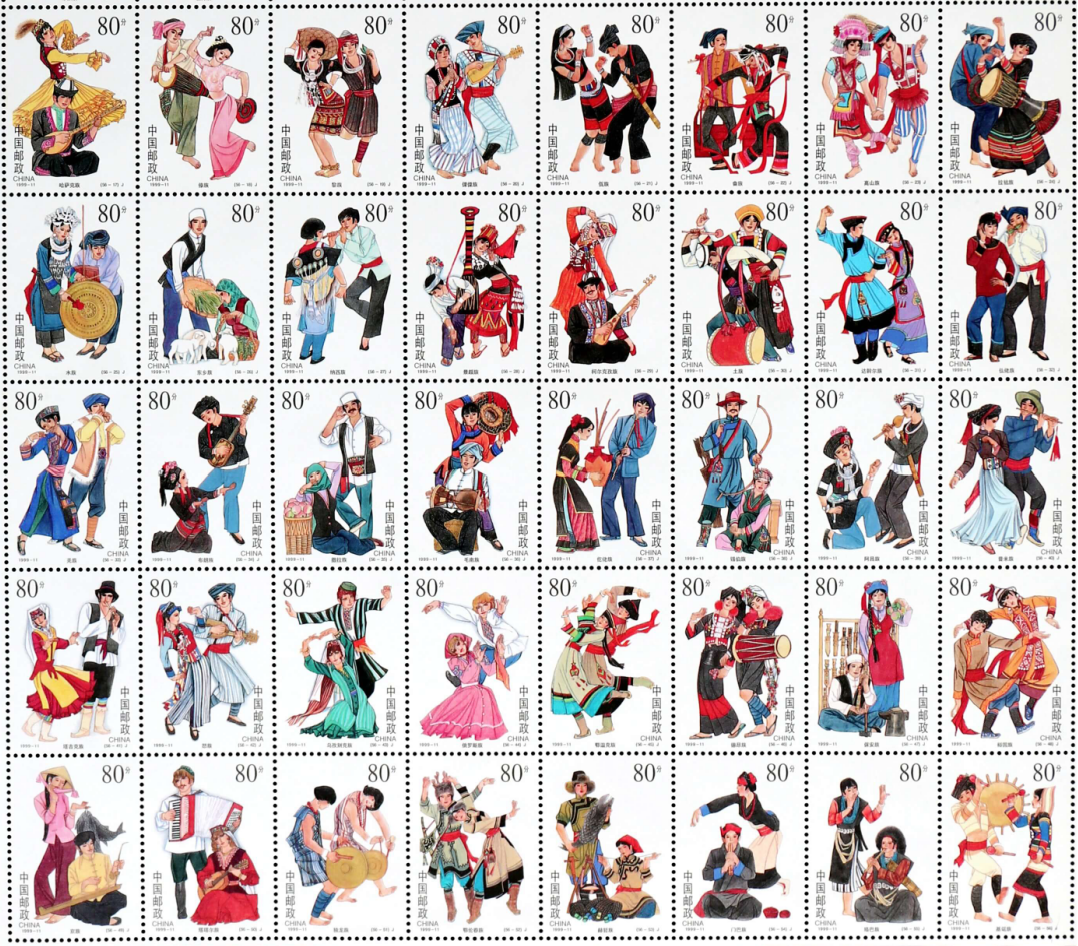 1999年10月1日,代表56个民族欢乐祥和、共庆共和国生日的《中华人民共和国成立五十周年——民族大团结》纪念邮票面世,邮票全套56枚,每枚代表一个民族,全套56枚印制在一张整版上,总面值44.8元。这套邮票从创意到生产完成历时10年,在中国邮票发行史上绝无仅有。