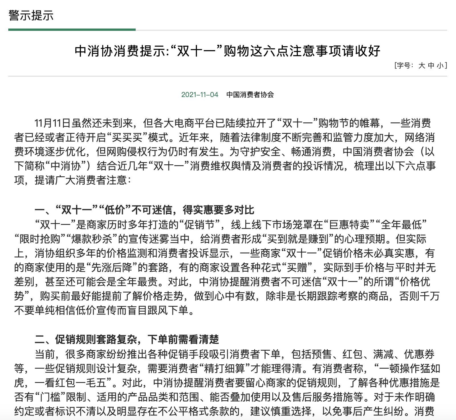 4日,中消协就今年“双11”发出消费提醒。其指出,近年来,随着法律制度不断完善和监管力度加大,网络消费环境逐步优化,但网购侵权行为仍时有发生。因此,结合近几年“双十一”消费维权舆情及消费者的投诉情况,梳理出六点个注意事项。