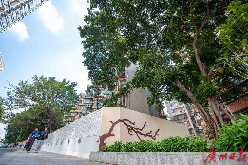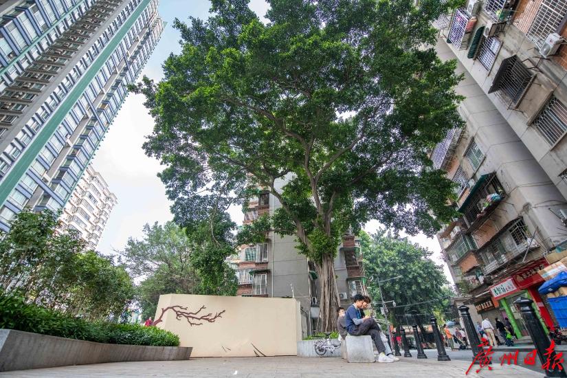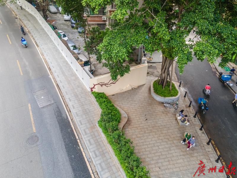 从淘金路往里走,老远就能看到斜坡上、路中央的一棵茂盛高大的榕树,生机勃勃的枝叶向外伸展着,有些甚至接近了人们的阳台。大树下有一个小小的广场,有石质座椅、温暖的黄色背景墙、人性化的过街通道,沿着坡度还新修了一条一百米多的人行道。上午十点多,人行道上走着来来往往的居民,石凳上坐着三两个晒太阳的老人,还有遛狗的市民在过街通道前静静等待,是广州老城里普通而悠然的一天。