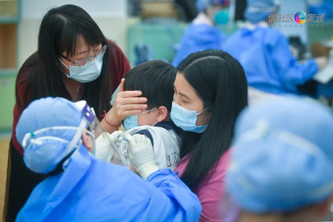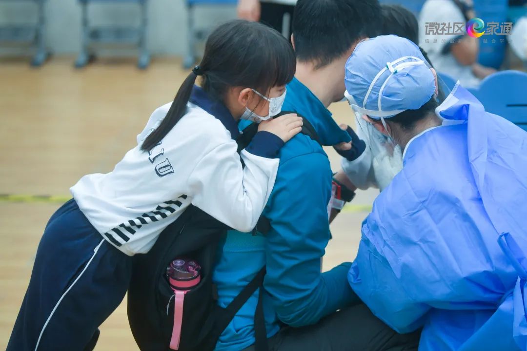 现场,有些低年级的小朋友产生了焦虑紧张的情绪,甚至是哭喊,学校老师与医护人员则在一旁安抚其情绪并温柔鼓励。
