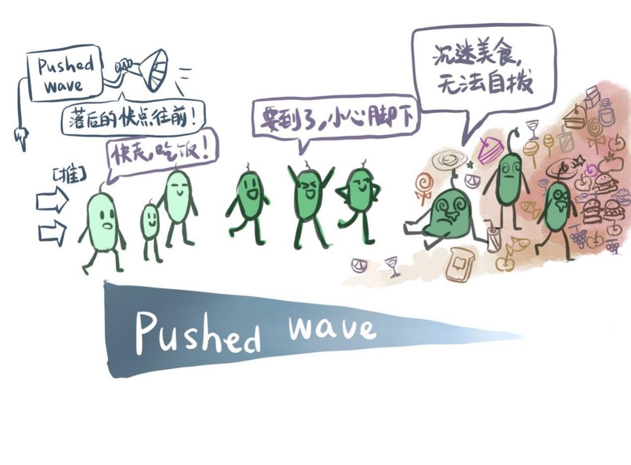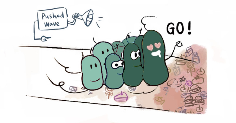 为了回答这个问题,研究人员对每一个细菌的运动轨迹进行了追踪与观测。他们发现每一个细菌都在群体中做往复运动:当细菌落在群体后面时,他们就会更努力地向前游动;一旦他们游在了群体的前端,则像失去了导航一样四处乱游,直到落在群体后端,又再一次奋力向前。这样的运动行为,就好像有一种力量在后面推着他们往前走似的,落在后面就推一把,跑到前面就不管了。