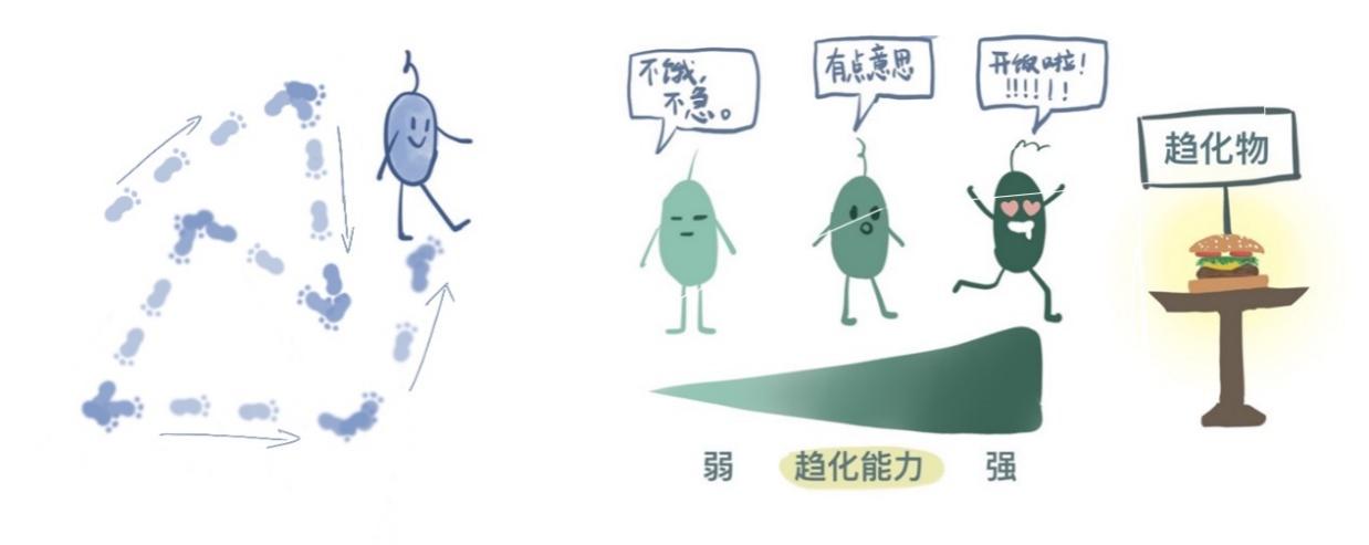 图说:细菌的随机游动与趋化运动能力差异示意图。
