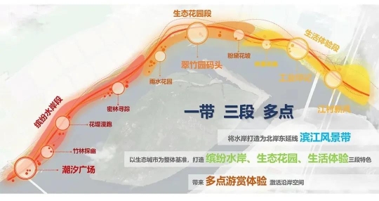 北岸公园东延伸段以北江堤岸为依托,一路蜿蜒向飞霞山市民体育公园方向延伸,沿途碧水蓝天,风光宜人,将规划为“一带、三段、多点”的空间结构,景观结构将根据规划结构及现状资源,打造缤纷水岸段、生态花园段、生活体验段三大特色景观段。