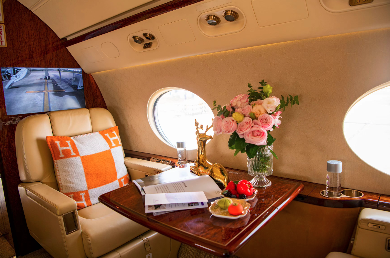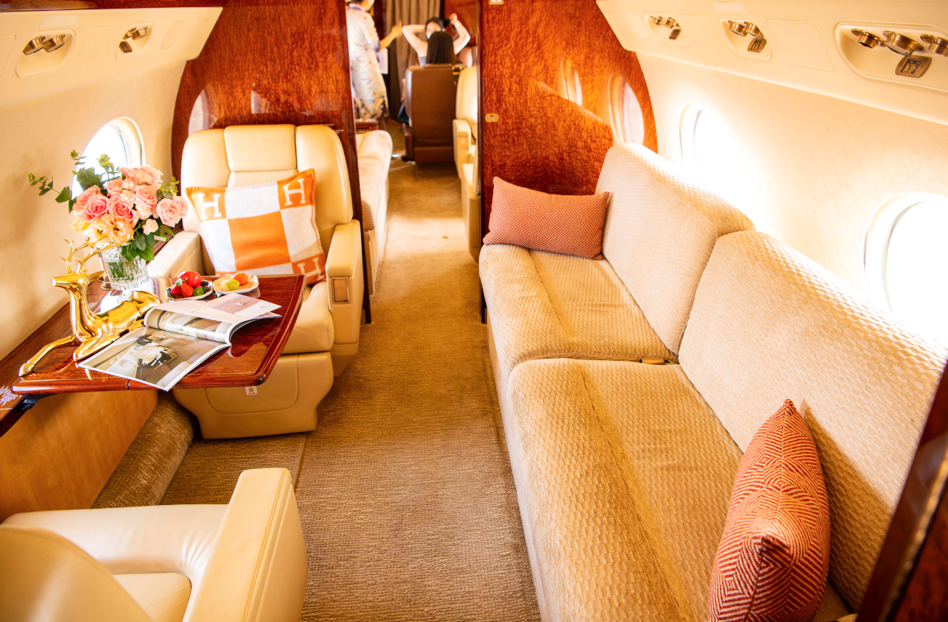 11月5日上午10时,进入白云机场FBO一架外观精致的飞机吸引记者登机,走进仓内,真皮沙发、四人用餐区域、厨房区和酒柜有序铺开,空间宽裕、装修精致、氛围风格舒适,不经意间恍如走进高端酒店。原来,这是与不少知名人士同款的湾流550型商务机,其最大航程高达12501公里,最高飞行高度为15545米,能轻松实现洲际飞行。